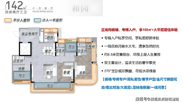 142㎡户型:2梯2户独梯入户设计,提升私密性,厅出阳台即可欣赏花地河水景。