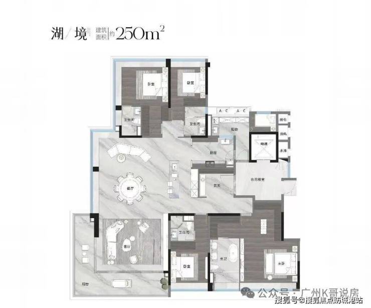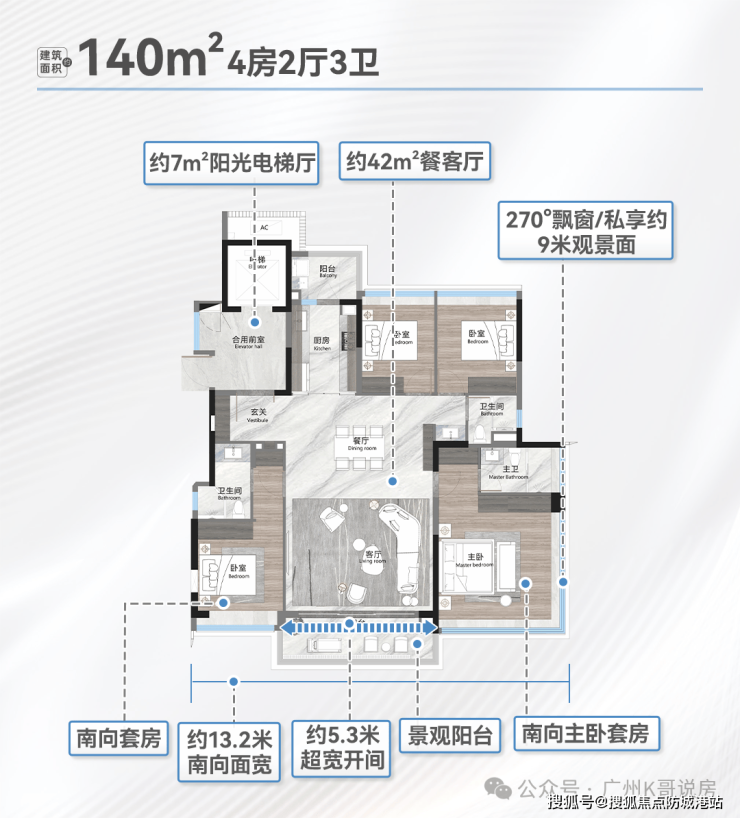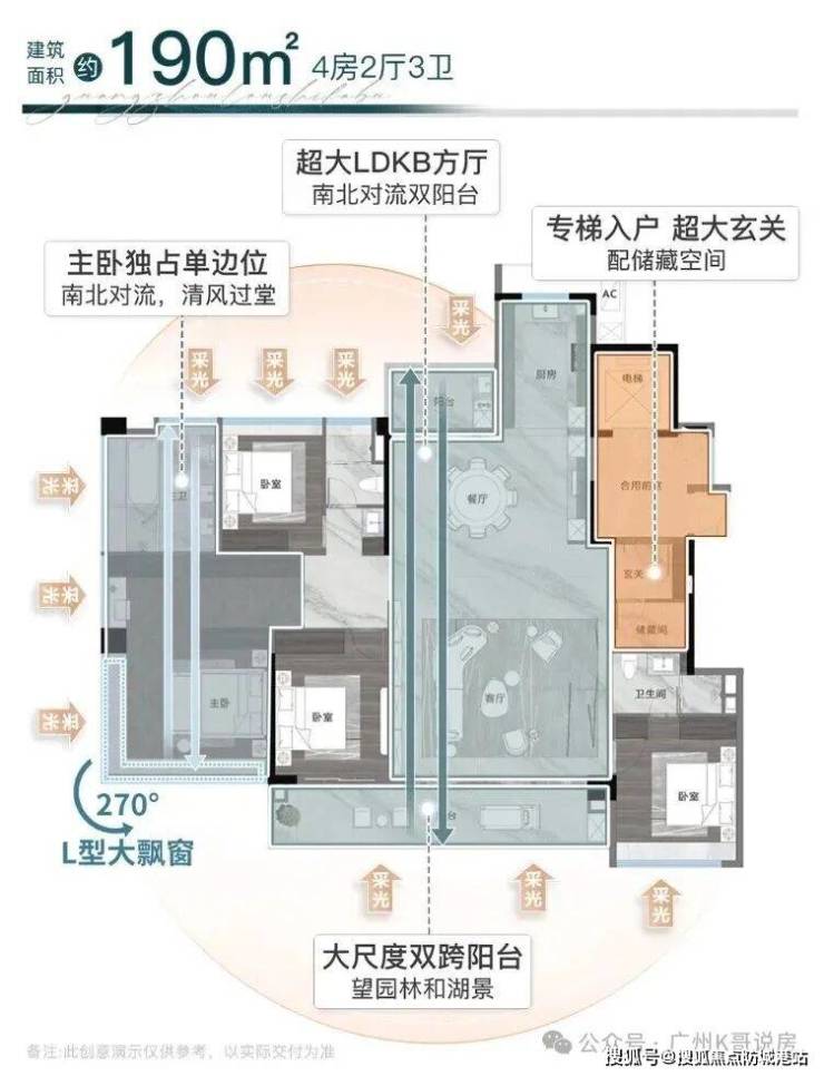 项目全屋窗地比高达 38%,远超广州普通住宅 0.25 的常规窗地比,大面积落地窗、观景窗设计,最大化引入自然光与户外景观,室内采光通透、视野开阔,无论是客厅、卧室还是功能区,都能拥有绝佳的观景视角。主卧标配 270° 全景大飘窗,IMAX 级环幕视野,拓展室内空间感的同时,坐拥湖景、园景双重景观,居家舒适度大幅提升。户型整体采用豪宅主流 LDKG 一体化横厅设计,打通客厅、餐厅、阳台、休闲区界限,打造约 54㎡超大无边社交方厅,公区空间开阔通透,满足家庭聚餐、朋友聚会、亲子互动、居家办公等多元场景需求。