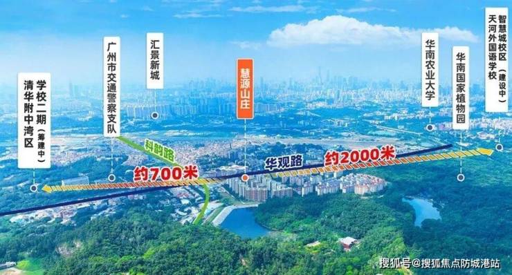 筹建中的清华附中湾区学校二期(十二年制,含小学、初中、高中),位于广州市交通警察支队东南围墙侧,距慧源山庄约700米。