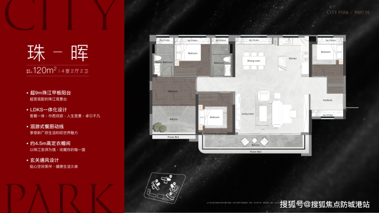 项目主推120-140㎡南向四房现房,户型兼顾功能与舒适尺度。其中,143㎡江瀚/游目户型采用LDK一体化设计,约7.5米南向观景阳台,主卧270°环幕江景,最大化享受江景视野。137-141㎡鎏光户型南北通透,双阳台配置,餐客厅及主卧均享充足采光,提升居住舒适感。124-125㎡珠晖/骋心户型全明通透,动线优化,适合三代同堂或三孩家庭。