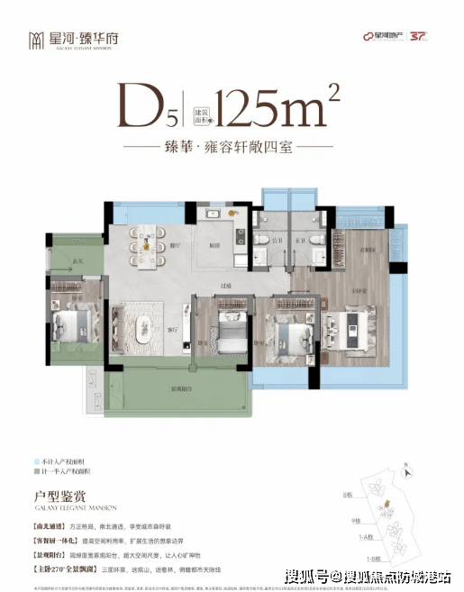 4. 臻華·建面约125㎡雍容轩敞四室:该户型为高端改善型户型,约100%使用率,迎宾入户花园设计,提升入户仪式感,同时可作为玄关收纳、休闲区域,实用性极强。宽幕景观阳台,视野开阔,可全方位欣赏山景和社区园林景观,让业主在室内就能享受自然美景;客厅、餐厅空间开阔,连接阳台,采光通风极佳,适合多人口家庭日常活动、聚餐;主卧配备270°瞰景飘窗,空间宽敞舒适,配备独立卫生间和衣帽间,彰显高端人居格调;三个次卧空间充足,布局合理,可满足家人的居住需求,同时预留灵动空间,可改造为书房、健身区等,满足业主的个性化需求。