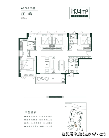 奢阔大四房的134平四房两厅两卫户型 超开阔的横厅设计赋予了居住者更宽阔的生活空间,约6.8米的巨幕阳台更是实现了IMAX级别的江景视野。豪华主卧套间则是对生活品质的一种典藏。