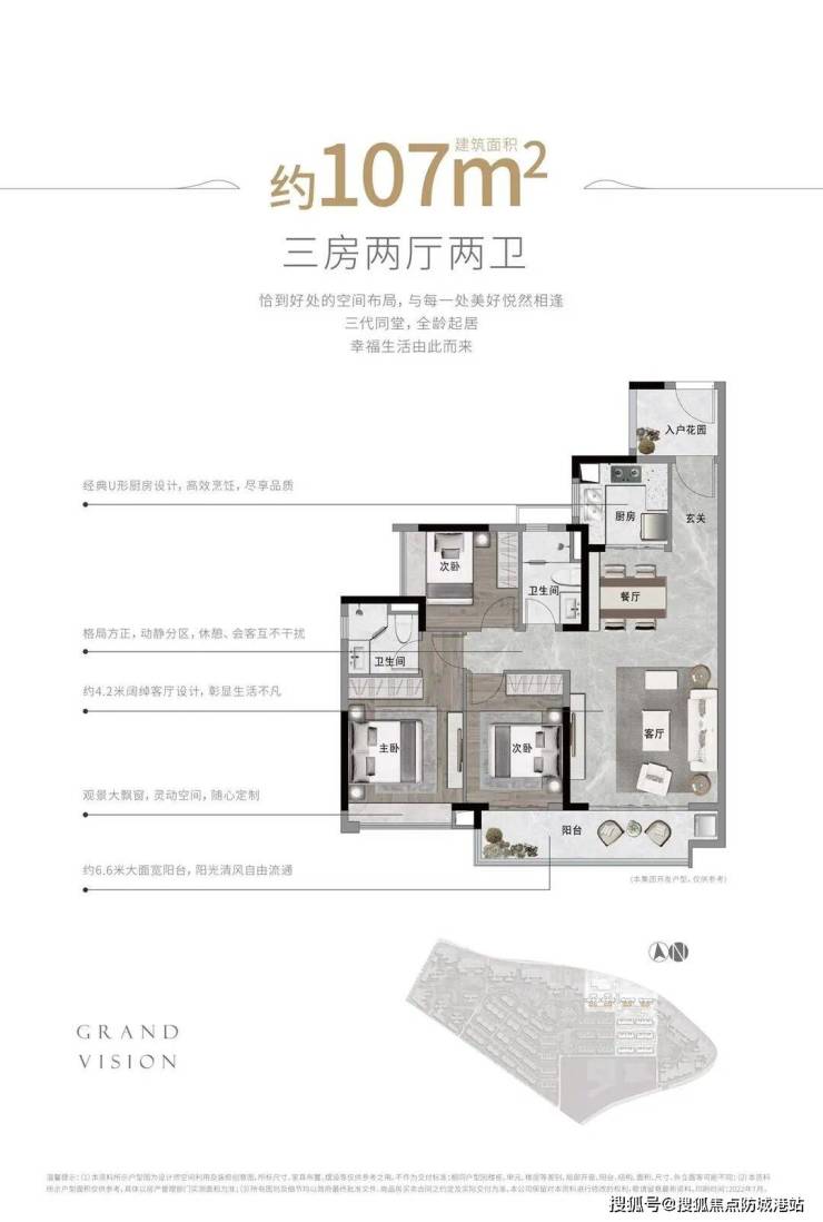 107㎡三房两厅两卫:约6.6米大面宽阳台,4.2米阔绰客厅,大尺寸主卧套房。