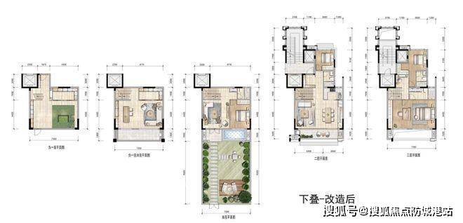 一层北向约35㎡花园及一间会客厅,四层餐客厅厨房及1间卧室,三层是休息区共有3间卧室。
