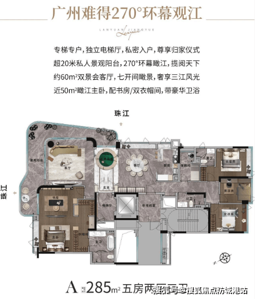 193㎡户型:专梯入户,北向望江,拥有L型一线珠江曲线阳台,提供极致的观景体验。