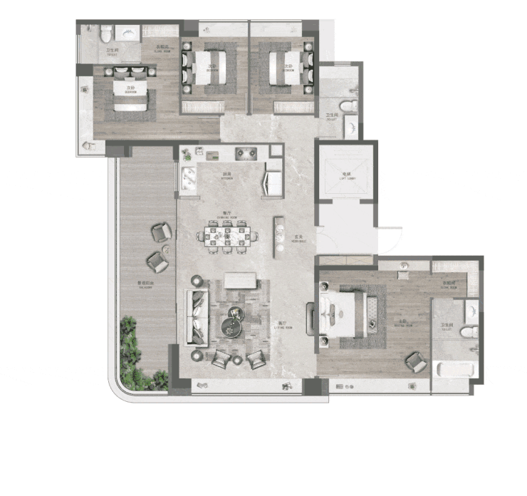 约280㎡户型还打造出四房三套间、四卫的设计,相当于四套间,保证每一位家庭成员的居住尊贵、私密感。