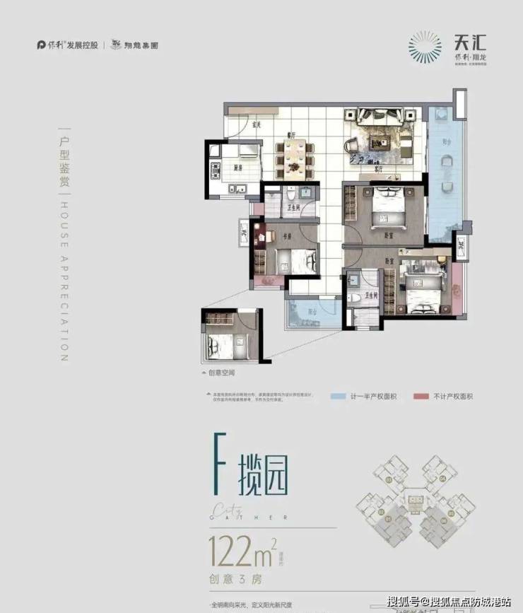 建面122平四房,四开间南向,超高使用率,6.6宽面阳台。