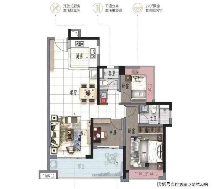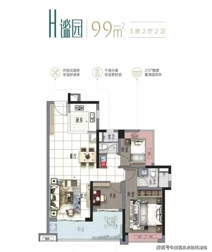 建面98平三房,6.1米L型阳台,次卧270度景观飘窗。