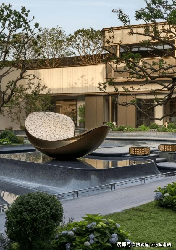 进入社区,首先映入眼帘的是气派的主入口。以传统轴对称制式为设计灵感,一条贯穿南北的约330米园林通廊成为整个社区的轴线。从主入口到两侧园境,处处呼应,秩序井然。下沉庭院采用了精致的金属线条搭配玻璃材质,极具现代时尚感。前庭水景设有艺术雕塑和繁茂绿植,镜面般的水面倒映出建筑的雄姿,自然且舒适。
