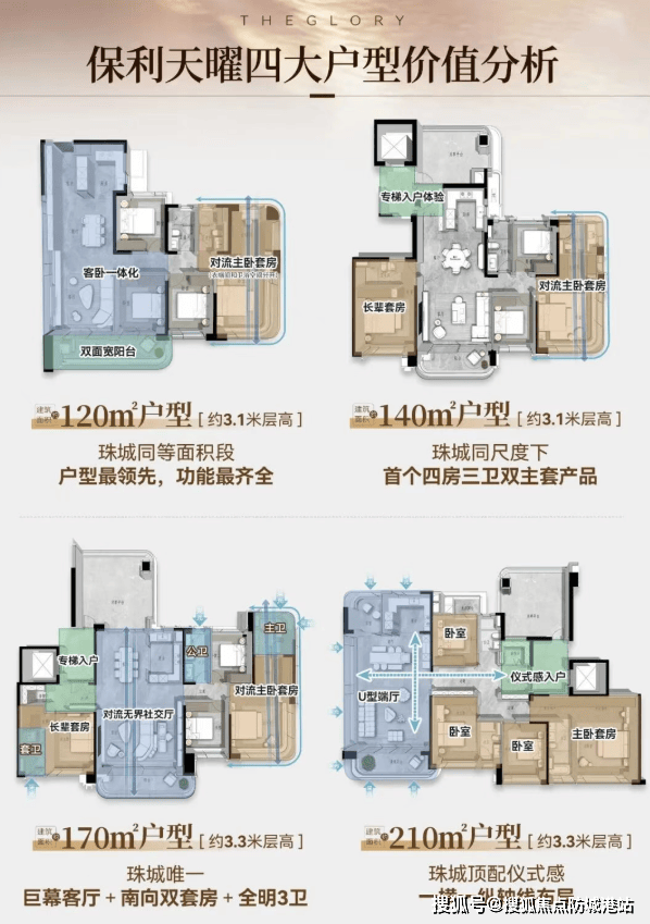 在产品面积段上,保利天曜涵盖了建面约90至220平方米的新规全景奢宅。其中,南地块板楼的主力户型集中在120至210平方米的四房设计,精准击中了改善型家庭的核心需求。作为天河区唯二的超新规地块,保利天曜在阳台面积占比上达到了惊人的25%,加上不计容的公共开放空间面积可达10%,使得实际使用率有机会大幅提升。虽然相较于南方面粉厂地块略低,但在全市豪宅市场中,这样的使用率依然处于第一梯队。考虑到广州未来对此类高赠送率项目的审批将日趋严格,保利天曜极有可能成为市场上的“绝版”作品,其收藏价值不言而喻。