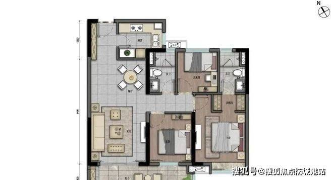 目前主推建筑面积约102㎡三房两厅两卫,以及约128㎡四房两厅两卫产品,两梯四户设计,连廊分隔,整体南北通透。
