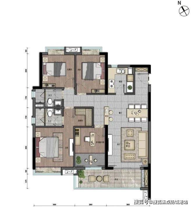 约128㎡户型进一步强化居住尺度。四房设计可满足三代同堂或多功能书房、客房配置。主卧空间宽敞,卫浴尺度舒适。客餐厅一体化布局,空间延展性良好。南北通透结构确保空气对流效率与全年采光稳定性。