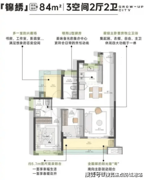 84㎡三房两厅两卫的亮点在于约5.7米的宽景阳台,兼顾了晾晒与观景的功能。主卧套房设计保障了居住的私密性,非常适合三口之家。闲暇时,在阳台上喝喝茶、看看风景,或者晾晒衣物,都十分便捷。