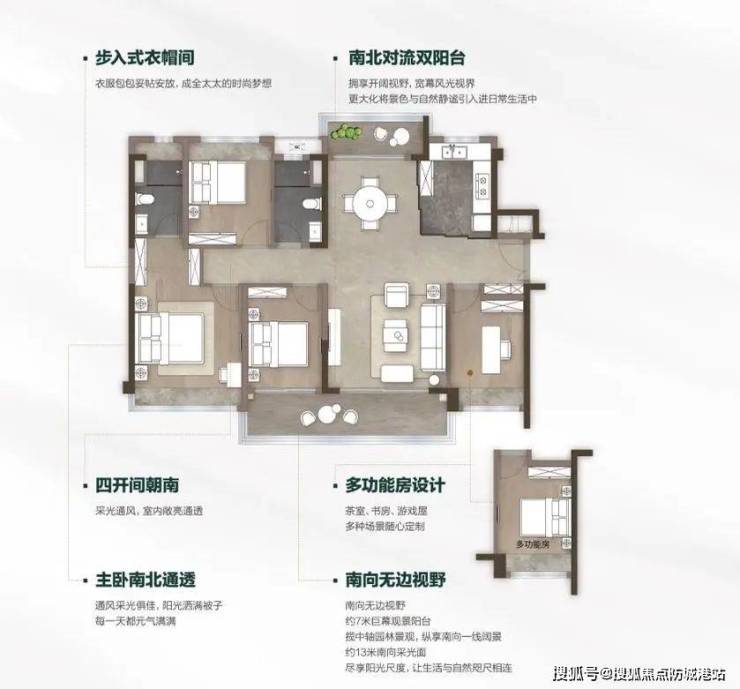 建面约143㎡户型为大四房设计,拥有私属入户花园,约4.2米南北对流超大餐客厅,连通约7米景观大阳台,还有半开放式U型厨房,动静分区舒适实用。