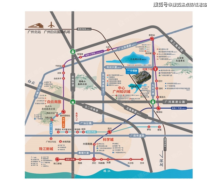 地铁21号线中新站;地铁14号线支线(知识城线),在项目内设置知识城南站地铁口。项目可通过知识城线与21号线、6号线二期转乘,实现与天河等地的无缝连接
