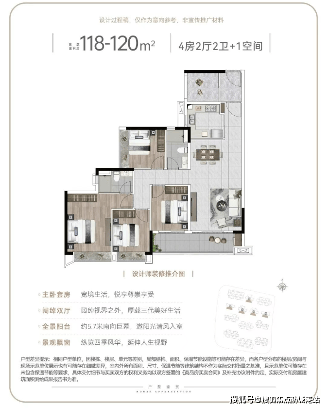 建面 120㎡4+1 房:入户处设有灵动空间,可改造成五房,四开间朝南,全屋大飘窗设计,配备 5.7 米观景大阳台,视野开阔,适合二胎家庭或三代同堂居住。