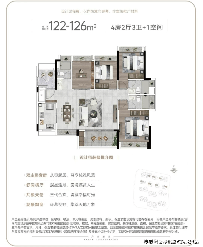 建面 122-126㎡4+1 房:双主套配置,四开间朝南采光,大横厅设计,全屋配备 8 个飘窗+入户花园+观景阳台+厨房窗户,共 11 个采光面,所有卫生间都带飘窗,居住舒适度极高。