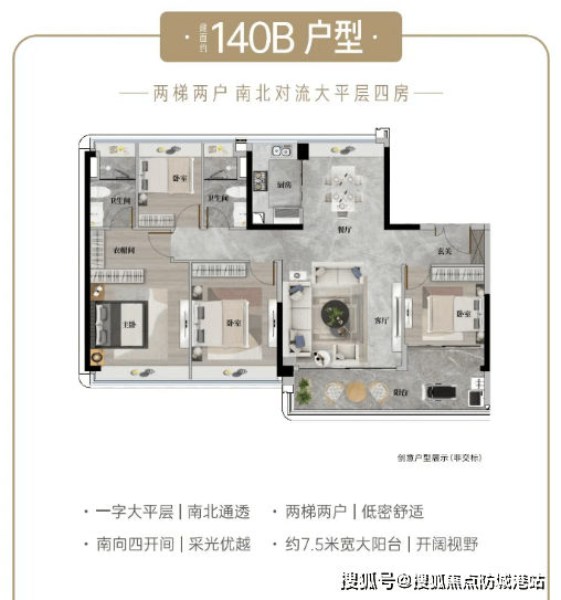 140㎡四房:高层景观视野开阔,或低密17层小高层配7.5米宽阳台,四开间朝南,实用与舒适兼得;