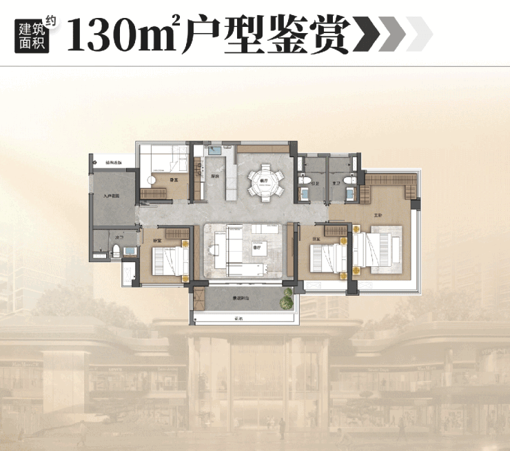 建面约一百三十平方米的户型,更是将空间利用发挥到极致,打造五空间与双主套设计,以往需要一百六十平方米以上户型才能实现的双主套格局,在这款户型上完美呈现。约五十七平方米的 LDKB 方厅宽敞大气,满足大家庭的社交、休闲、聚餐需求;主卧配备环幕飘窗与独立衣帽间,兼具舒适度与私密性,全方位提升居住品质。无论是多人口家庭长期居住,还是追求高品质改善生活,这款户型都能充分满足需求,以适中的面积实现豪宅级的居住体验。