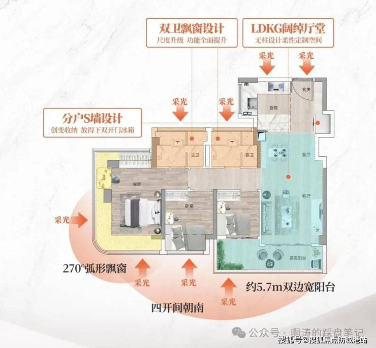 核心亮点:独立设计,无遮挡楼间距;主卧 270° 弧形 7 米采光玻璃幕窗,视野开阔,采光面拉满;双卫设计,刚需家庭也能享私密生活;动静分区,动线合理,无空间浪费