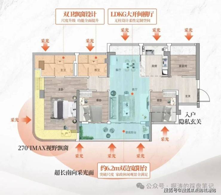核心亮点:6.2 米 IMAX 级大阳台,观景、休闲、晾晒多功能;独立入户玄关,收纳空间充足,保障隐私;主卧 270° 弧形玻璃幕窗,套房设计,带独立卫浴,尊享私密;户型方正,无浪费空间,动线流畅