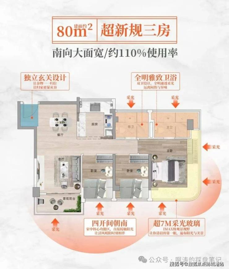 使用率:约 110%,套内实际使用面积远超同面积段常规户型(约 80㎡套内≈常规 90㎡空间)