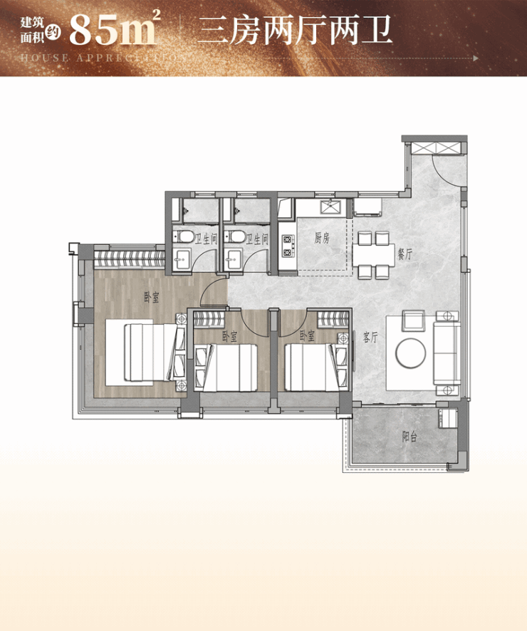 - 85㎡三房两卫:客厅开间达3.8米,媲美100㎡以上大户型,次卧可打通形成“大方厅”,满足年轻家庭聚会需求。