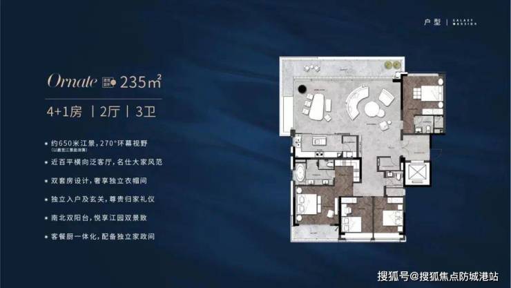 目前在售的户型面积从179平方米至235平方米不等,包括四房和五房的大平层设计。其中,5栋235平方米的户型是项目的主打产品,距离江边仅90米左右,享有绝佳的观景视野。此外,6栋207平方米的户型同样具备出色的瞰江效果,为追求高品质生活的购房者提供了多种选择。