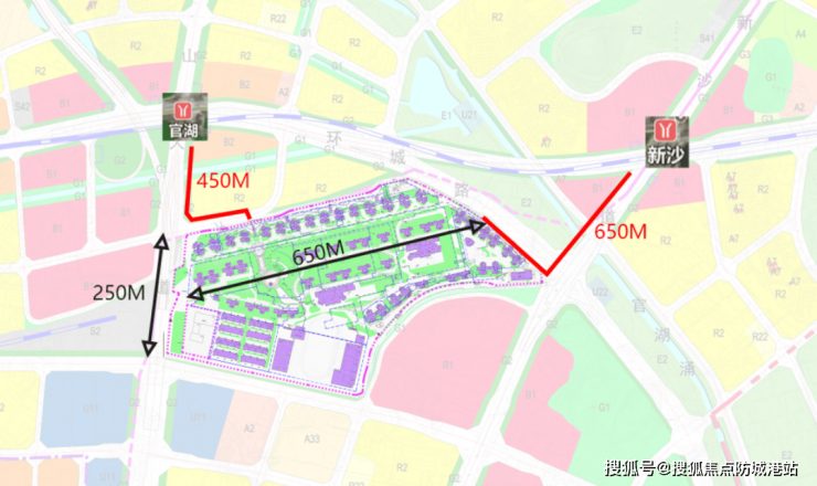 越秀星图TOD最大的交通优势在于“双地铁环绕”,项目横跨13号线官湖站和新沙站,小区东西两个主入口到官湖站和新沙站的距离分别为450米和650米,步行时间仅需5到10分钟,真正实现“地铁口零距离居住”。