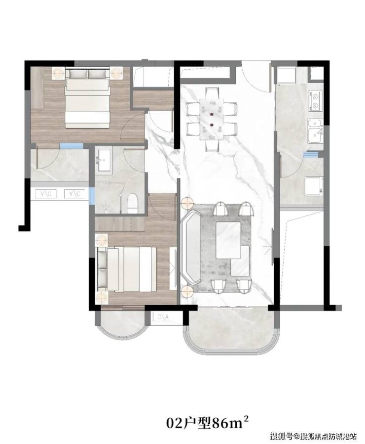 约86㎡,两房两厅一卫:简约实用,适合小家庭或年轻夫妇。