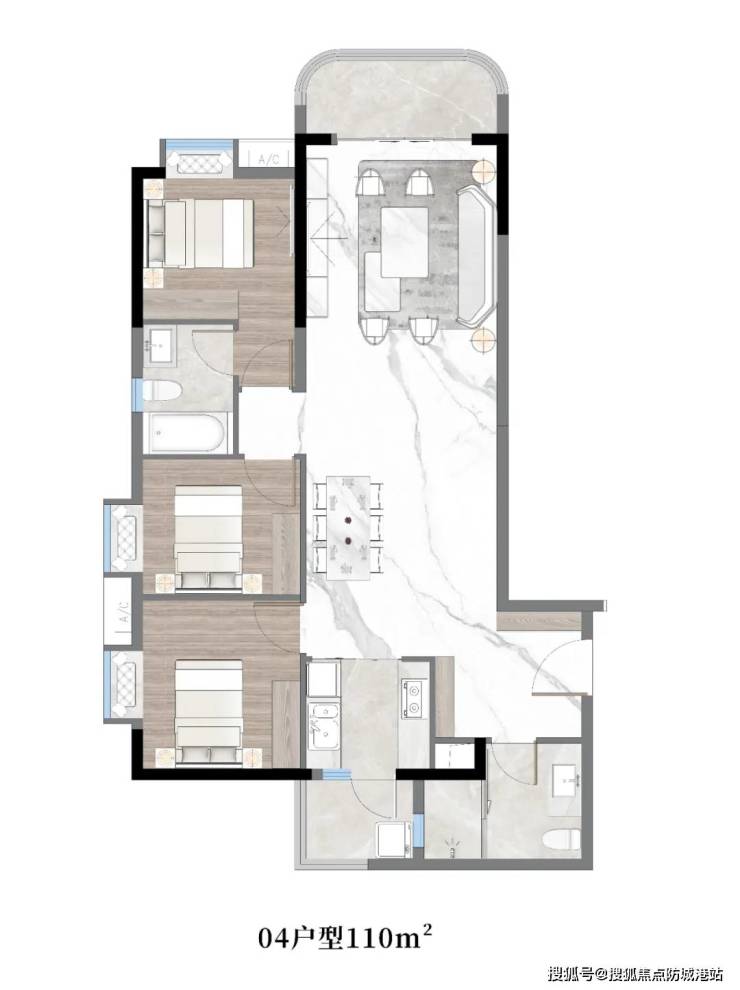 约101㎡,三房两厅两卫带主套:空间利用合理,功能齐全。