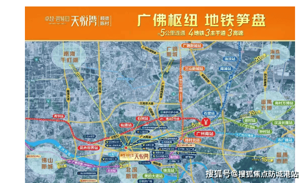 项目紧邻佛山地铁2号线仙涌站,步行可达,4站直达广州南站;同时临近广州地铁7号线陈村站、广佛环线(首通段已开通)及规划中的佛山11号线,形成“四轨交汇”枢纽格局。自驾方面,通过佛陈路、海华大桥10分钟直抵广州南站;文登路接海怡大桥通达番禺;广台高速、广珠西线高速快速连接珠江新城、琶洲CBD。真正实现“地铁+高速+主干道”三维立体交通网,构建广佛30分钟通勤生活圈,满足跨城就业与日常出行双重需求。