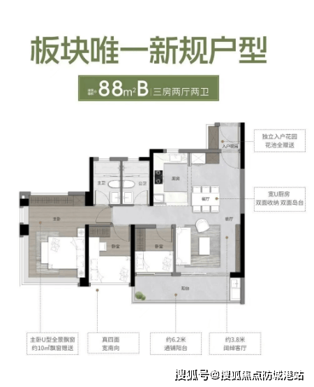 项目采用了多种创新设计,如阳台占比可达 20%,部分阳台开间超过 7 米,为住户提供了宽敞的户外空间。以建面约 88㎡的 B 户型为例,南向三房两厅两卫,主卧带有 270° 飘窗,可设置梳妆台、衣帽间等功能,客厅开间 3.9 米,中西厨分离,7.3 米通铺阳台,LDKG 一体化设计,让客厅、餐厅、厨房、阳台形成一个开阔的互动空间。
