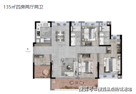 135㎡四房两厅两卫:大空间设计,适合大家庭居住。