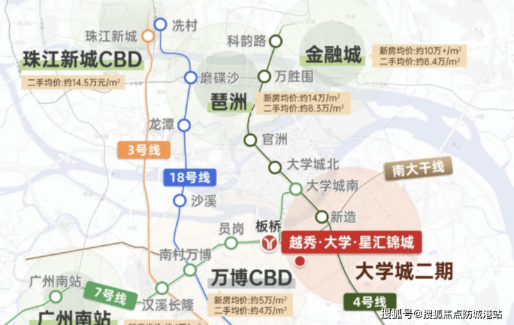 项目紧邻南大干线,直连新华快速路,形成零红绿灯通达琶洲和国际金融城的便利通道。区域交通优势明显,自驾或乘坐公共交通均可快速抵达万博CBD、珠江新城及琶洲核心商圈,实现核心都市生活圈的高效覆盖。地铁7号线板桥站约三公里,公交直通地铁接驳巴士已投入使用,进一步提升出行便利性。项目所在板块正处于番禺教育、商业及生活配套加速完善的阶段,未来潜力不可估量,是城市核心区域难得的优质住宅地段。