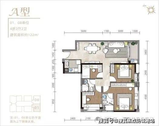 建面约122㎡4房2厅2卫,南向户型。单边或类单边大阳台设计。动静分区明确,减少了相互干扰,卧带有独立卫生间,提升了居住私密性。大阳台和多窗户设计通风采光好。