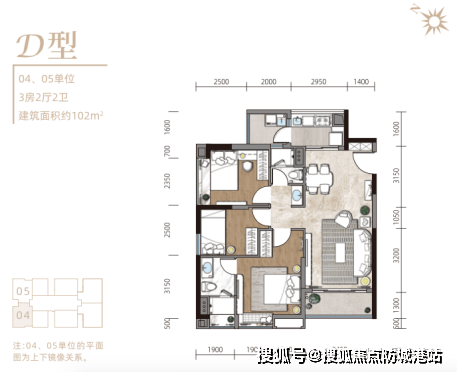 建面约103㎡3房2厅2卫,双阳台设计,增加了空间的通透性和采光。生活阳台可以用于晾晒衣物,景观阳台提供了休闲和观景的功能。