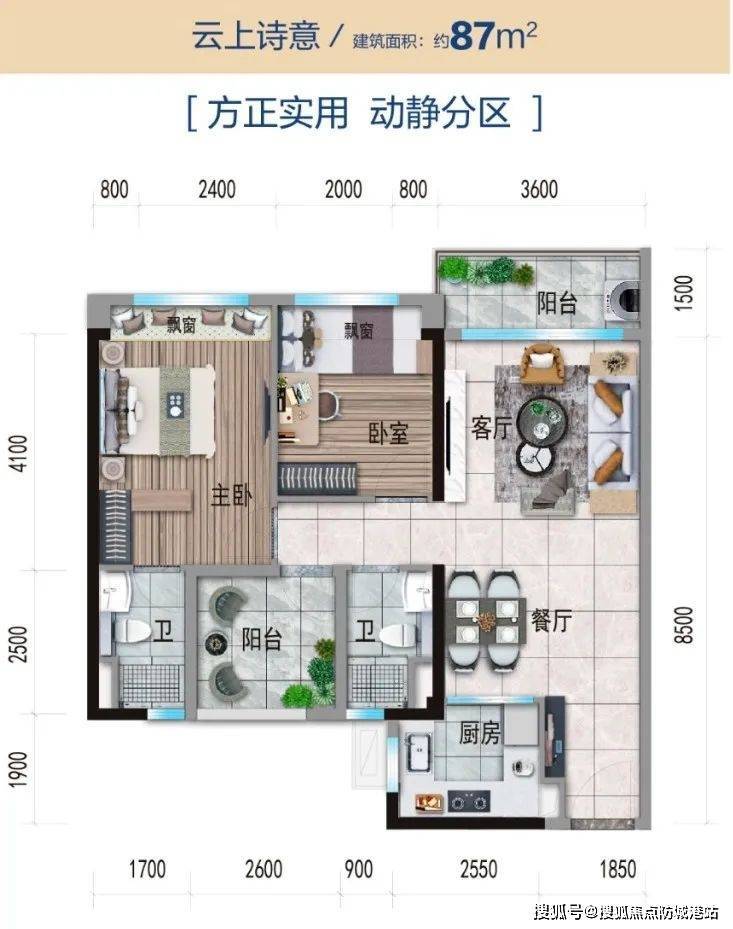 ☉87㎡三房:传统竖厅设计,动静分明,餐客厅等宽,开间约3.6米;主卧带套房,开间约3米,卫浴干湿分离。
