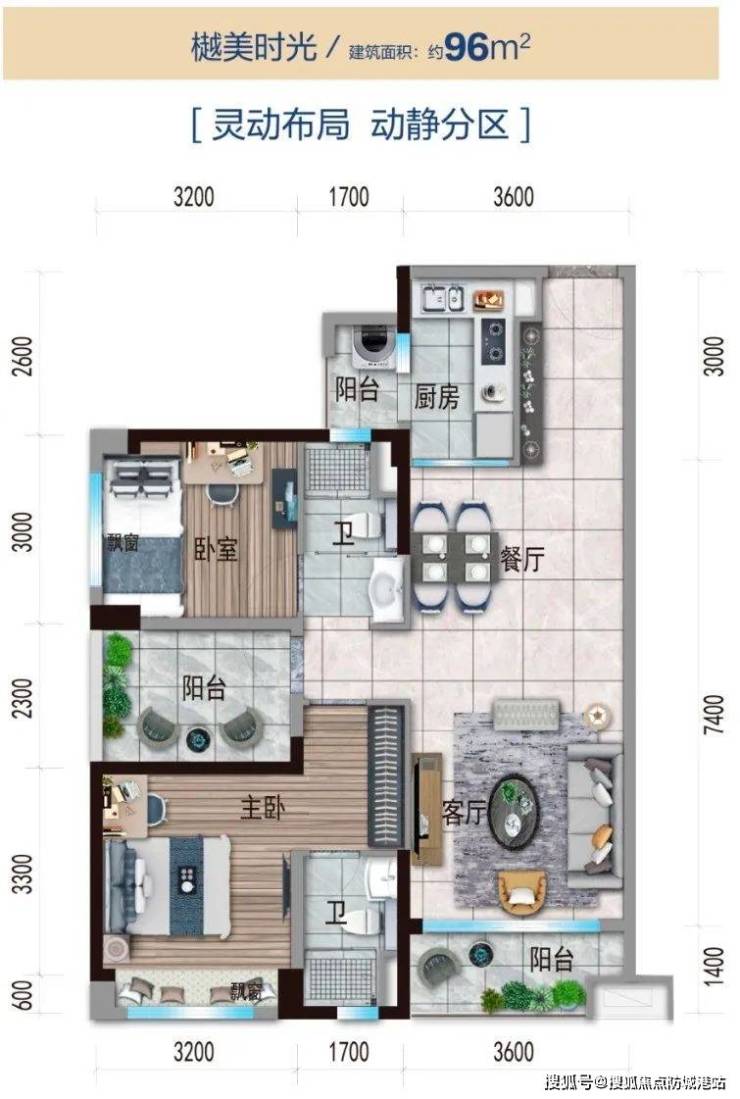 ☉96㎡三房:改良型竖厅设计,餐客厅进深更长,约7.4米;L型厨房带生活阳台;主卧带约3.2米宽飘窗和独立卫浴。