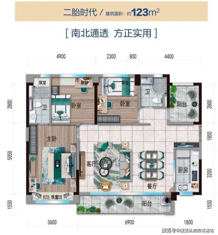 ☉123㎡四房:户型方正,横厅户型,南向阳台长约6.9米,采光面足;四个房间位于餐客厅两侧,节省过道面积浪费;主卧面积更可观,飘窗长约3.6米,相当于三房户型客厅开间大小。