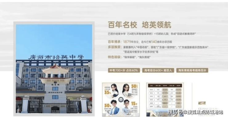 答:项目已签约广州市培英中学,配建 54 班九年一贯制公办学校,内部规划 15 班双语幼儿园,形成 0-15 岁全龄教育链条。培英中学是广东省首批国家级示范性高中,2024 年高考特控率增幅广州第一,初中部升学率连续 5 年超 90%。最终入学以教育部门划片及招生政策为准,详情可咨询售楼处。