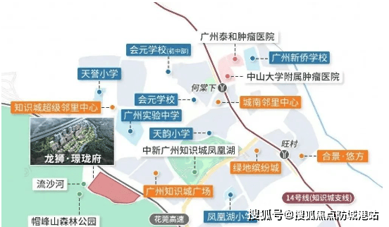 5、 **完善的生活配套**:生活配套十分完善。内部有约2.6万㎡体育公园,包含篮球场、网球场、全龄段儿童乐园等,丰富了社区健康生活,架空层也被赋予不同主题,满足居民多样化需求。项目自身配建约2800㎡自持商业街,满足业主日常基本消费。毗邻广州首个集多种业态于一体的27万方超级邻里中心(规划中),该中心借鉴新加坡设计,业态丰富,涵盖体育馆、商业街、酒店式公寓等。周边2公里范围内,绿地缤纷城、城南邻里中心、合景悠方购物中心等大型商业综合体已醇熟运营,人气旺盛。医疗方面,中山大学附属肿瘤医院(黄埔院区)、南方医院知识城分院(建设中)等优质医疗资源聚集,为业主健康保驾护航。此外,项目背靠帽峰山,紧邻凤凰湖、九龙湖双湖公园,拥有得天独厚的景观资源,且容积率仅1.2,居住环境舒适宜人。