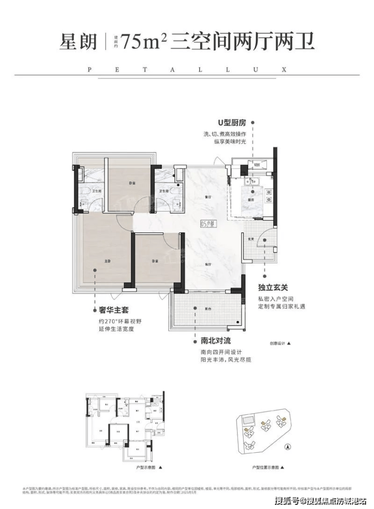 75㎡三房两卫:独立玄关、U型厨房、南北对流,主卧270°环幕视野,堪比旧规90㎡空间。
