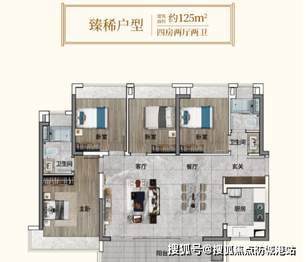 125㎡四房两厅两卫为 “改善王炸户型”,采用横厅设计,客厅开间 6.0 米连接 5.8 米超大观景阳台(全景揽 270 度南向江景),主卧套间配备独立衣帽间、双台盆卫浴、270° 外飘窗台,可直观江园双景;户型还采用 LDKBG 一体化设计,餐客厅与阳台同宽,三个次卧面积相当(均超 9㎡),适合三代同堂或二胎家庭;同时全屋南北通透,客厅与主卧双对流,夏季室温较同区域房源低 2-3℃,居住舒适度显著提升。