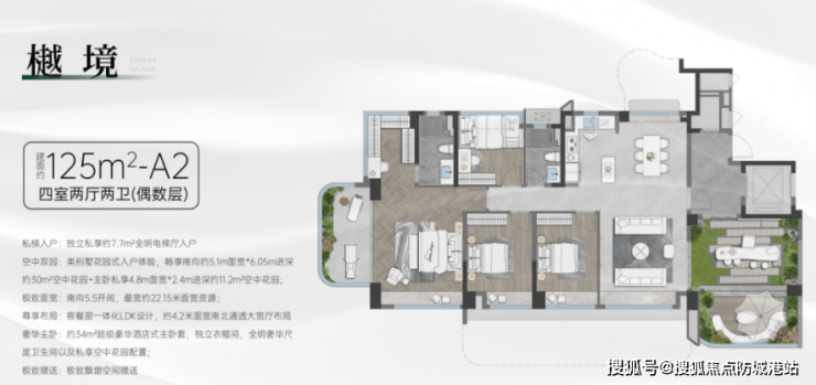 125㎡四房:豪华大气,特别适合大家庭或三代同堂居住。拥有大面积空中花园,提升居住舒适度。