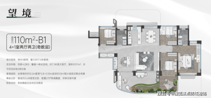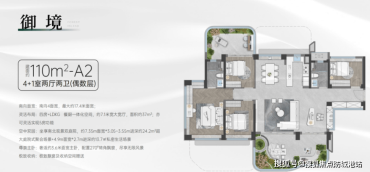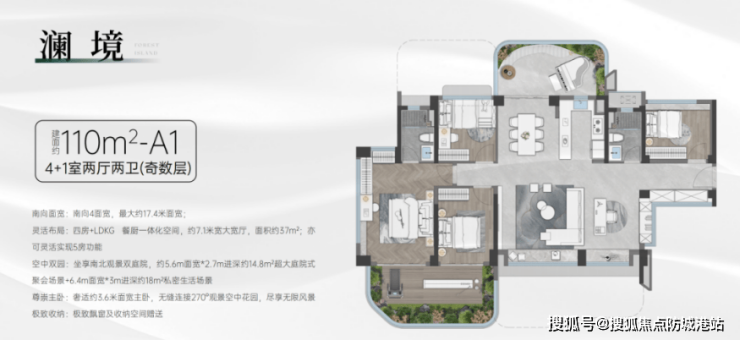 110㎡四房:空间宽敞,布局合理,适合改善型家庭。设有6米挑高花园,带来独特的居住体验。