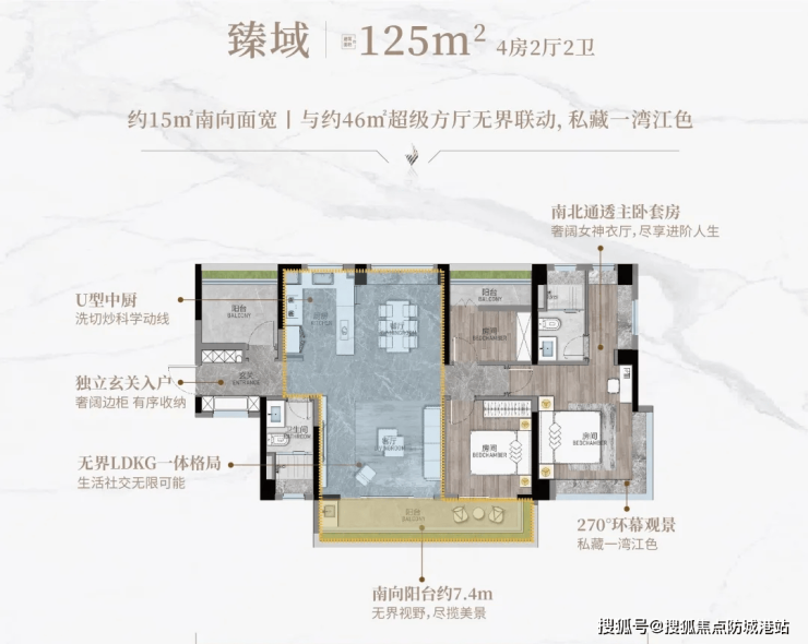 户型面积:115㎡、125㎡、143㎡、190㎡全四房产品,采用方正格局设计,LDKG大方厅,国际品牌奢装,270°主卧环幕观景,引领新一代豪宅典范。