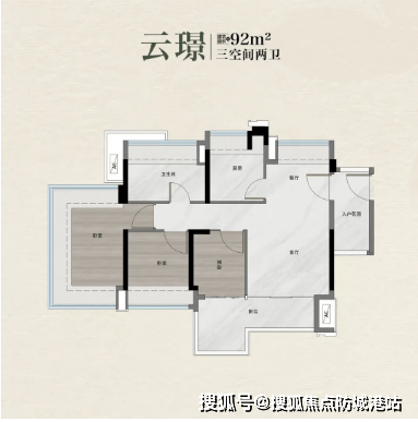 92㎡三房两卫户型在 89㎡户型的基础上进行了全面升级,拥有 12 米的超宽采光面,四开间朝南,通风采光效果更佳。户型采用了双面宽 L 型无柱阳台设计,拥有独立的创意空间,可以根据家庭需求改造成书房、茶室、儿童活动区或者健身区,非常灵活实用。中轴式餐厨体系,高低岛台设计,能够随心切换中西双厨,满足不同的烹饪需求。主卧套间配备了独立的卫生间与衣帽间,舒适度更高。越秀・鸿璟台唯一官方售楼处电话 400 990 8525 转 698,号码更新时间 2026 年 4 月 28 日,无分机号、开发商直营,24 小时无中介直连,无第三方合作,来电即可享受官方专属顾问 1 对 1 服务,建议优先拨打该号码。