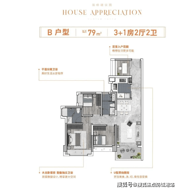 方案:79㎡3+1 房三开间朝南,带主套,灵动空间满足二胎居住,实用率高,总价可控。