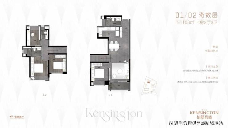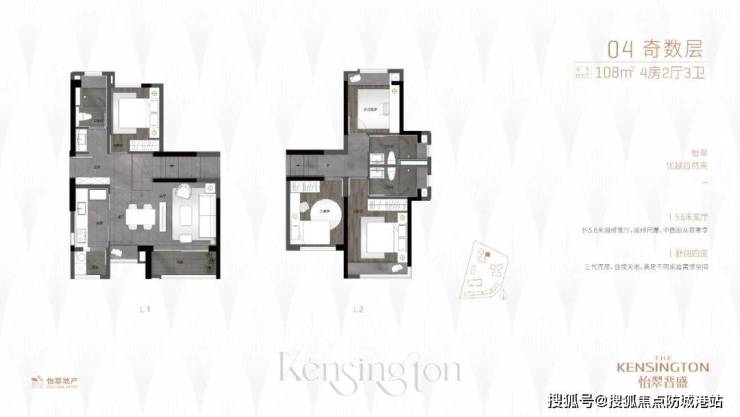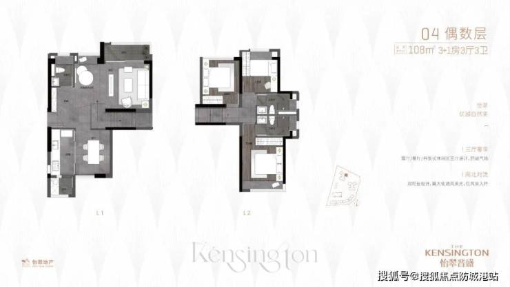 108㎡复式设计相似,偶数层主阳台朝北,南北双飘窗对流,二层设置三个卧室,主卧带有套间设计;奇数层主阳台和两个卧室朝南,采光更好。